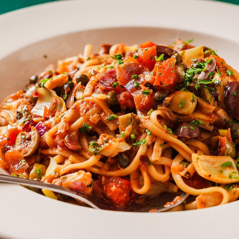 Fusilli with Chicken, Garbanzo Beans, Tomato & Artichokes