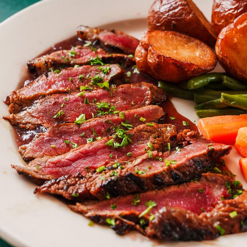 With choice of toppings (Onions, Mushrooms, Bacon, or Cheese) with pickle, tomato, red onion, and roasted potatoes